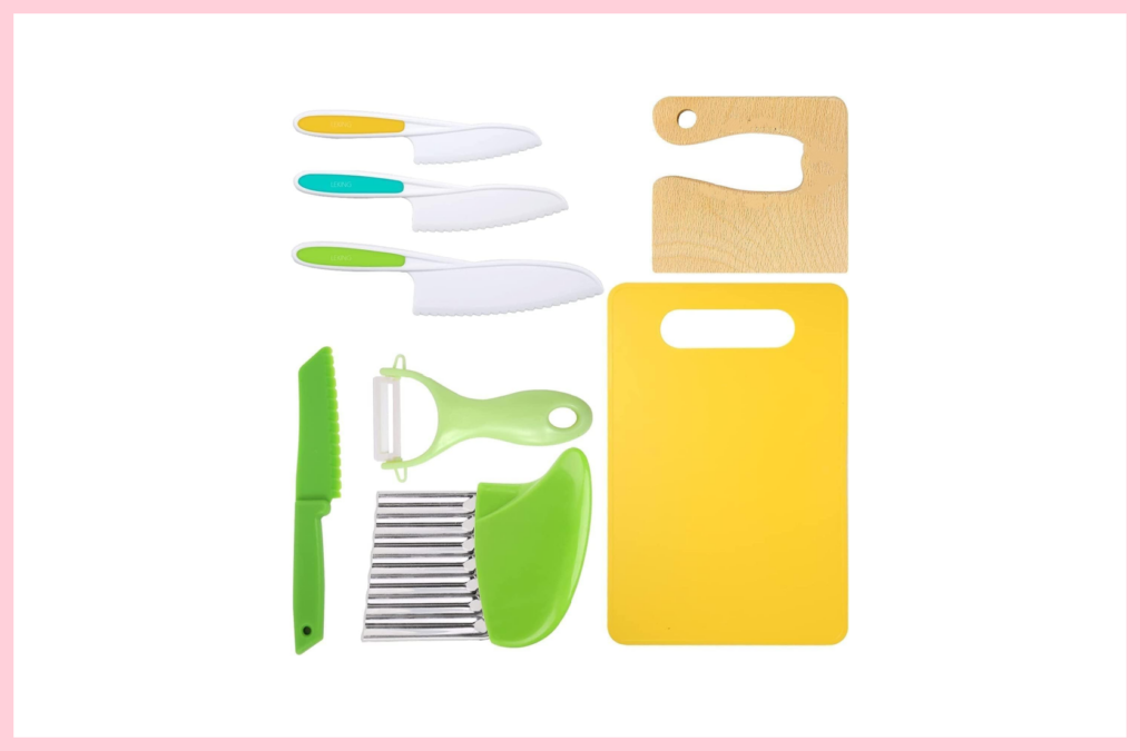 Small people do not like to sit on the sidelines when it comes to cooking! I love that this set lets get right up in the action, chopping vegetables and peeling potatoes like a pro! Kids in the kitchen always need a grown-up nearby, but these plastic knives and graters make it a little safer (and a lot more fun) for them to help out.