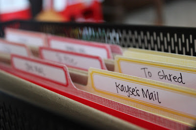 I absolutely love this system! First of all, because it WORKS! It is an easy place for me to quickly sort things, and really and truly eliminates the paper clutter that had overtaken our kitchen. Secondly, it encourages me to actually sort through the paper as it comes in. Since there is a place to put it all, I don’t put off going through the mail and other papers like I used to. And lastly, it’s pretty. 🙂 The reds, oranges, and yellows match our kitchen colors, and the black matches the granite and blends in on the counter. I’m a happy camper with my new filing system! Paper clutter, be gone! 🙂